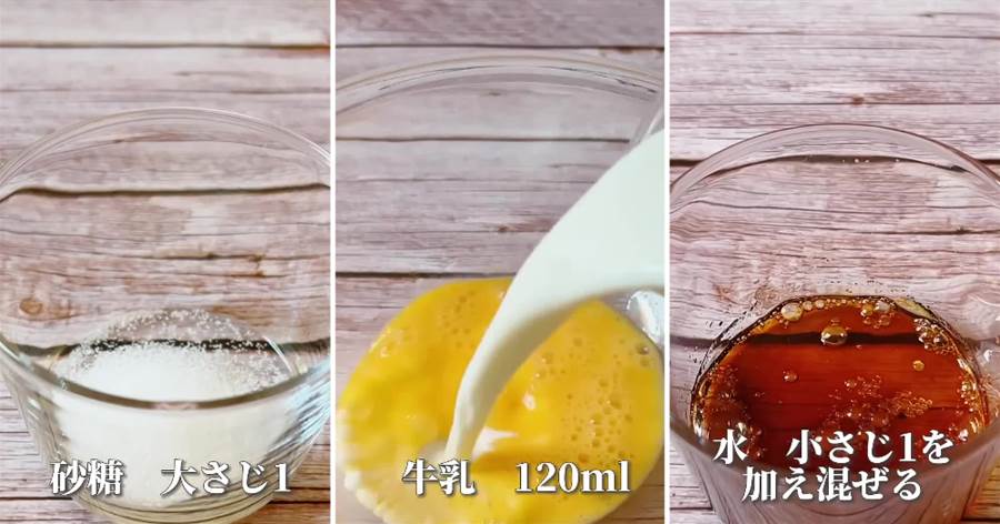 5.カラメル…砂糖15グラム、水5cc、レンジで1分、水5cc、卵一個、牛乳120cc、砂糖15グラム、茶漉ししてレンジで2分!よし作るゾ