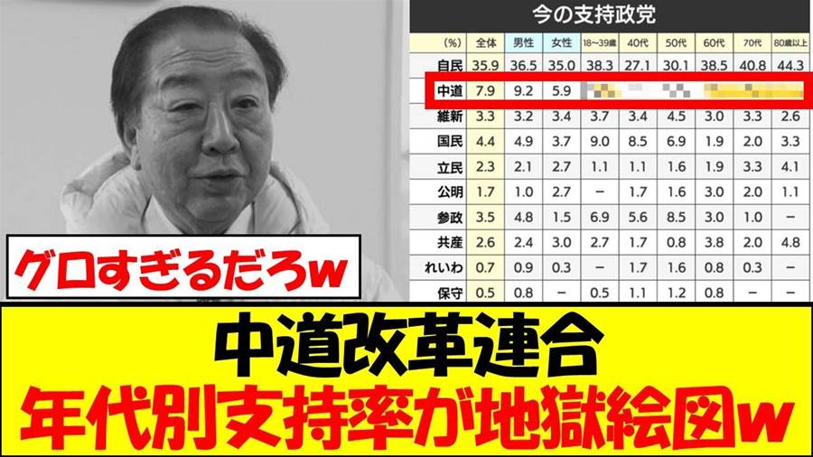 今日は皆さんにぜひご紹介したい映像があります!中道改革連合の支持率が、年代別に見ると低迷を極めています。その中でも特に若者層が無関心であることが際立っており、衝撃的な「地獄絵図」とも言える状況が広がっています。この現状に対する興味深い視点として、あるコメントでは「団塊世代の若者見捨て」が語られ、次世代に託すべき未来が危ぶまれています。