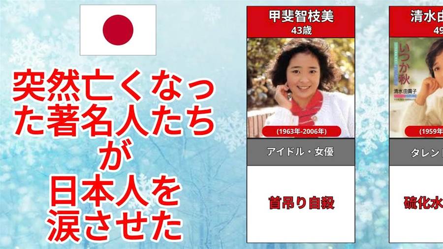 3.甲斐智枝美は知らなかったなぁ。清水由貴子は介護疲れだったよなぁ。松来さんはもっと難しい病名だった様な。後、千葉真一がない。