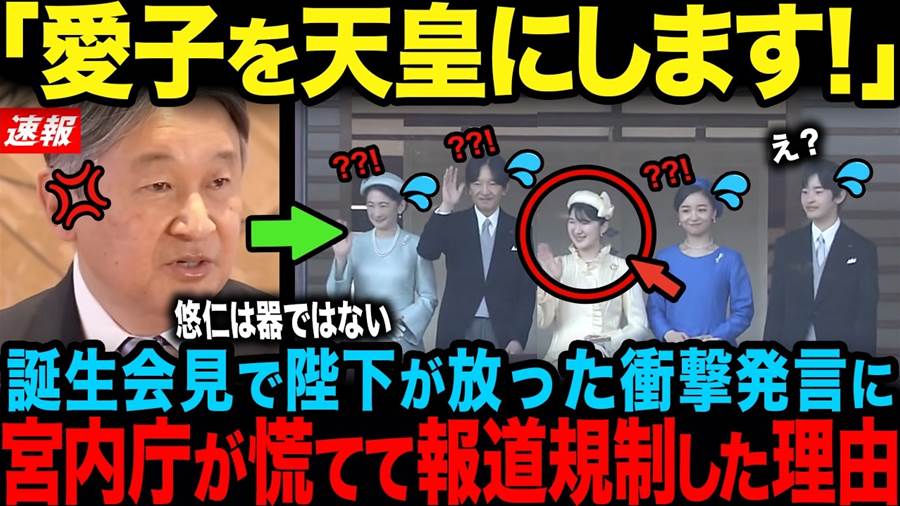 今日は皆さんにぜひご紹介したい映像があります!天皇陛下が誕生日会見で発した衝撃の発言が、皇位継承についての新たな視点をもたらしました。陛下が愛子さまの名前を先に挙げたことに、宮内庁が動揺した様子が伺えるのです。この出来事は、国民の心に「次期天皇は誰か」という疑問を投げかけています。
